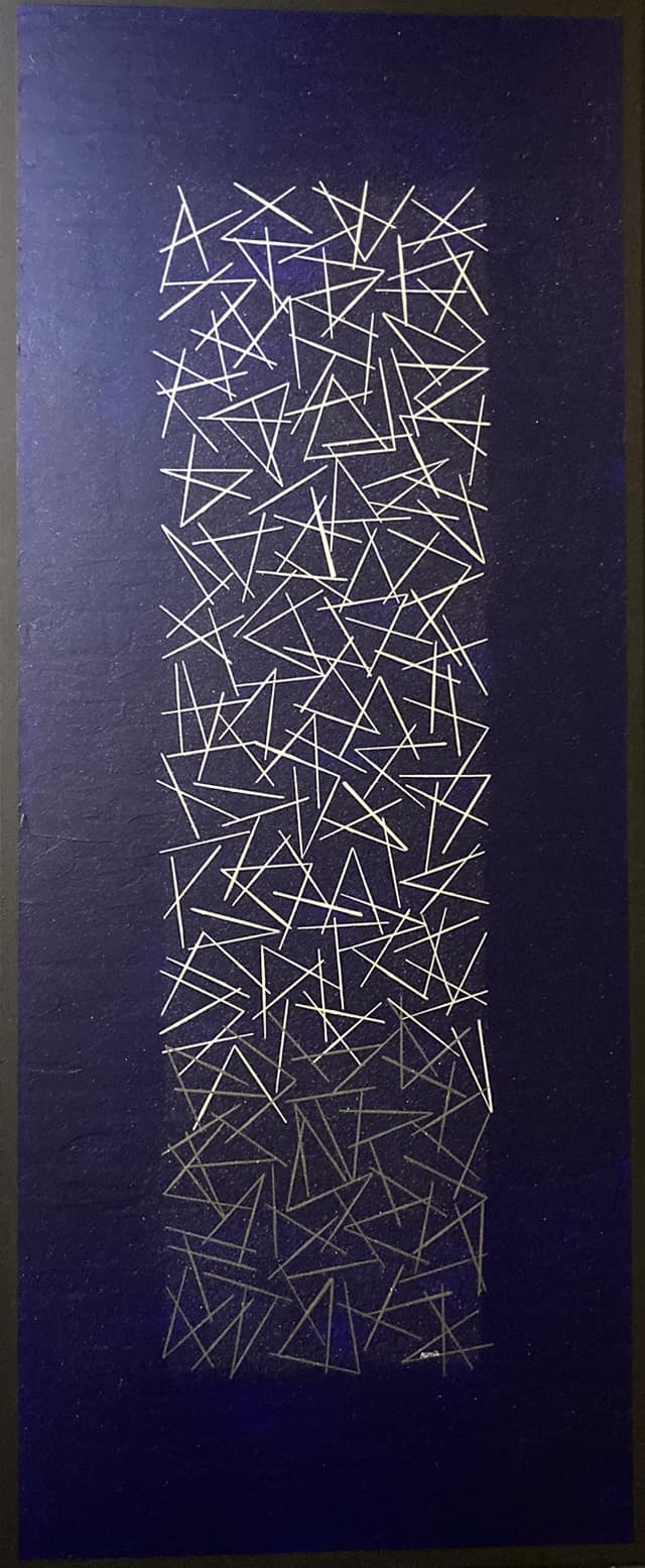 Welke schilderijen mee gaan weet ik nog niet, misschien deze wel. Zilver en grafiet op donkerblauw met zilveren spikkeltjes en een zwart randje.(1.20mx0.50mx0.04m)
