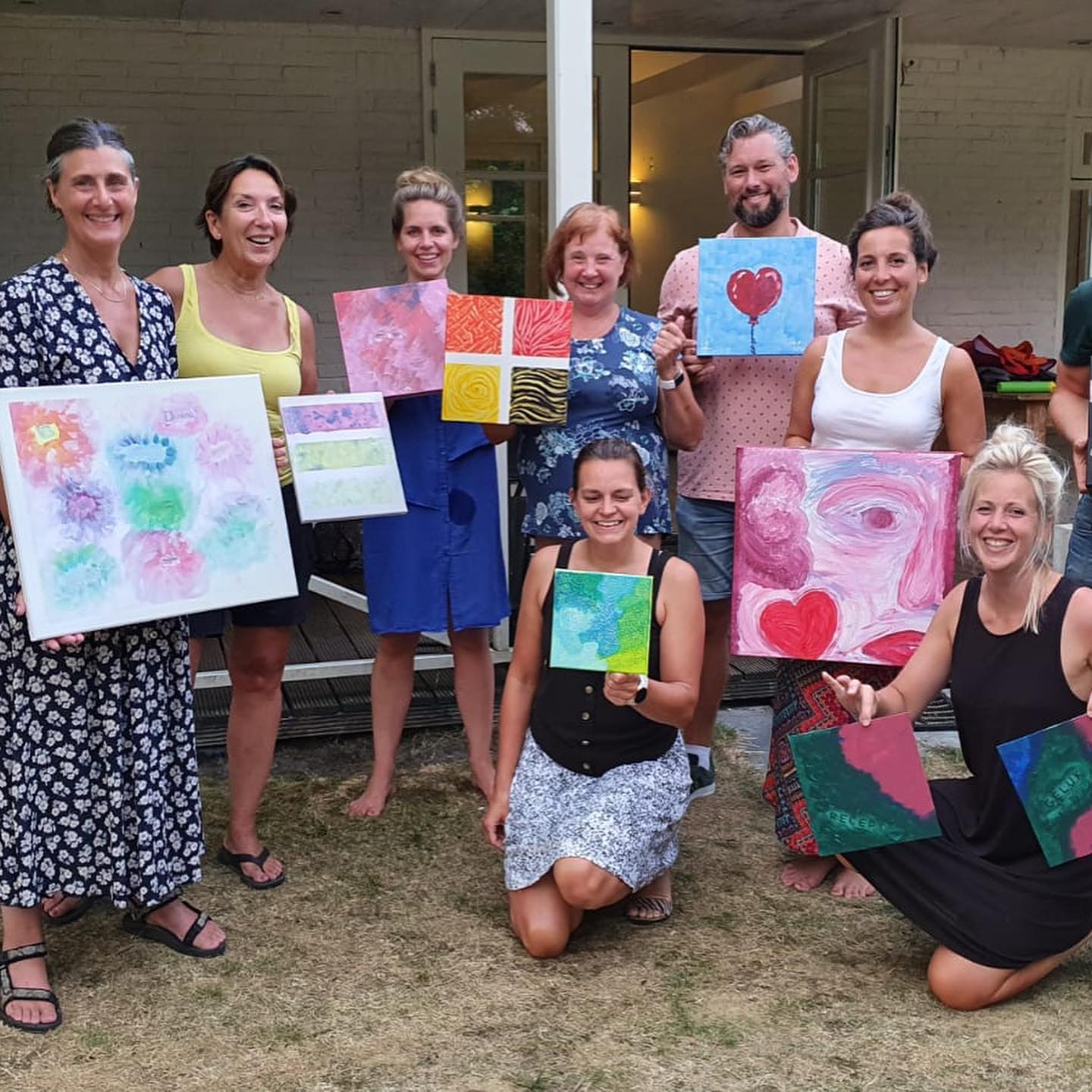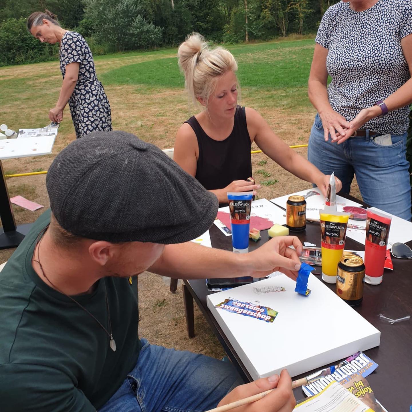 Je hoeft niets mee te nemen, alle materialen zijn inbegrepen (doek 50×50 cm, verf, gebruik van kwasten, spatels en dergelijke)